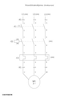 Dette er en enkel start og stopp system på en kloakkpumpe, denne er avhengig av hvor mye tanken vann og avløpsvann er i tanken, S2 er nivåvippe som skal starte motoren til kloakkpumpen når tanken er fylt opp. Kloakkpumpen skal stoppe når S1 nivåvippe ikke har noe mer vann/avløpsvann i tanken. Systemet er 24V å unngå jordfeil. Ved feil skal termisk motorvernet F3 utløse, denne skal stilles etter motorens merkestrøm.